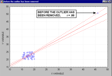 Ak je vzorka relatívne malá, vylúčenie každého bodu, ktorý nie je čistý vybočujúci bod, má za následok silný vplyv na regresnú priamku aj samotný korelačný koeficient. Ako vidieť na nasledujúcom obrázku,niekedy je ťažko určiť, či sa jedná o vybočujúce body, alebo iba o extrémne hodnoty.
